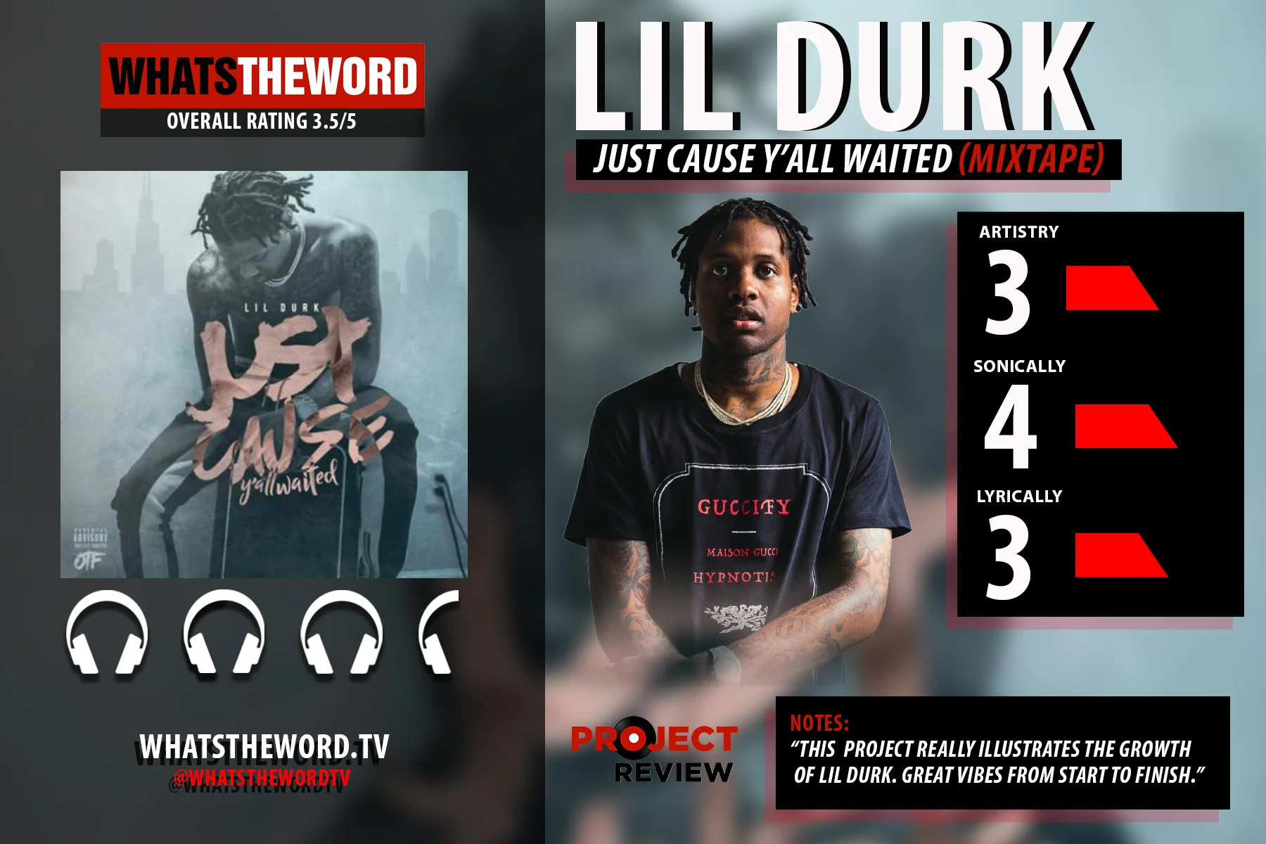 The mixtape is well put together, some of these tracks would ofThe mixtape is well put together, some of these tracks would have been dope on an Album. I.E. “Breather” featuring Ty Dolla $ign & Partynextdoor. “How I know” featuring Lil Baby is another track. I love when collabs with TK Kravitz, the “Home Body” record is a great track to ride too when a guy is a companied by a female friend.There are no real radio singles on here so it. It clearly wasn’t album ready, but as a mixtape, Durk came strong. You can tell he has grown as an artist, but the overuse of melodies and autotunes is getting old.