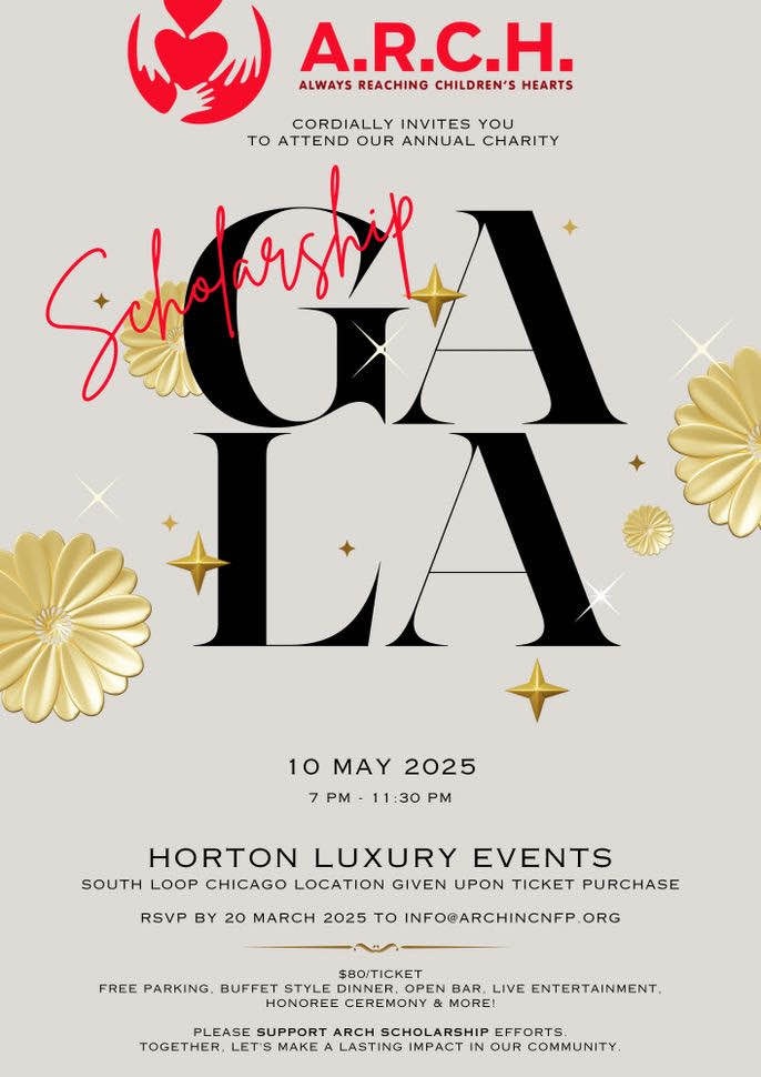 Always Reaching Children’s Hearts (ARCH) Inc. is honored to invite you to support our Annual Scholarship Gala on May 10, 2025, at Horton Luxury Suites from 7:00 PM to 11:30 PM. This special evening will celebrate our mission of uplifting the youth of Chicago’s most underserved communities through mentorship, educational tutoring, and Fine Arts programs.