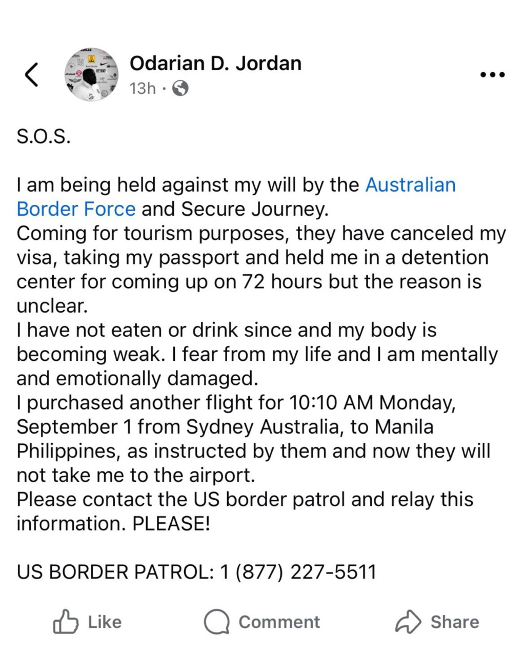 A Chicago man by name of Odarian D. Jordan has sent out an urgent plea for help after being detained by the Australian Border Force and private contractor Secure Journey while traveling for tourism.