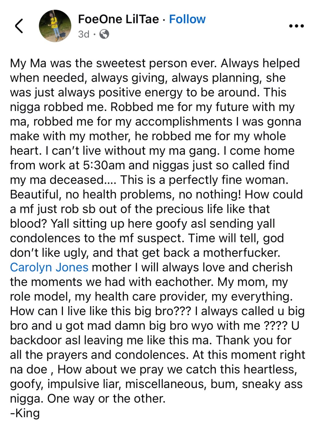 Carolyn’s son, who found his mother unresponsive and has been publicly grieving online, shared several emotional posts calling for justice and remembering who his mother truly was.