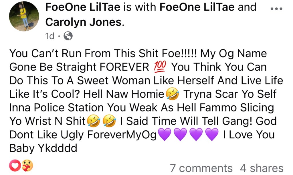“You can’t run from this shit, foe! You think you can do this to a sweet woman like herself and live life like it’s cool? Hell naw.”
