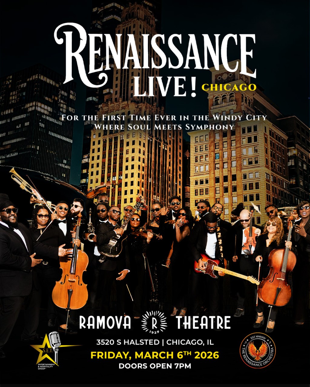 The Renaissance Orchestra is bringing its “Where Soul Meets Symphony” tour to the historic Ramova Theatre for a one-night-only performance on Friday, March 6, 2026. Doors open at 7:00 PM CST, with the show set to begin at 8:00 PM CST.