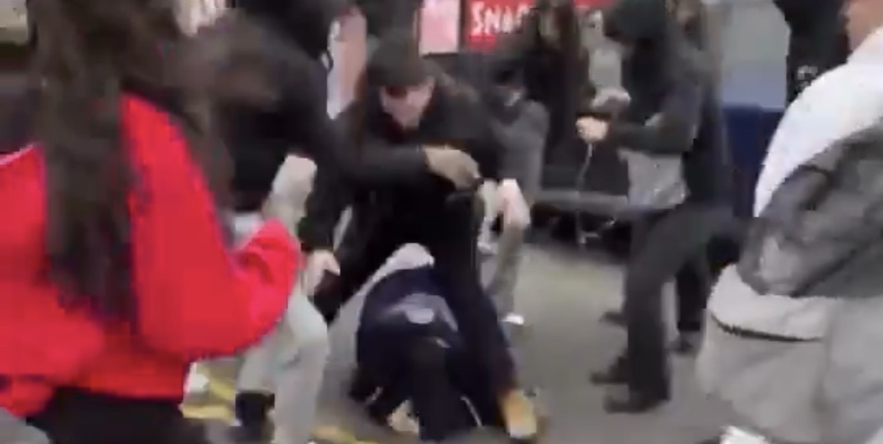 The fight, which is now going viral, took place against students and a man at the strip mall on Higgins Rd. & Nagle Ave.