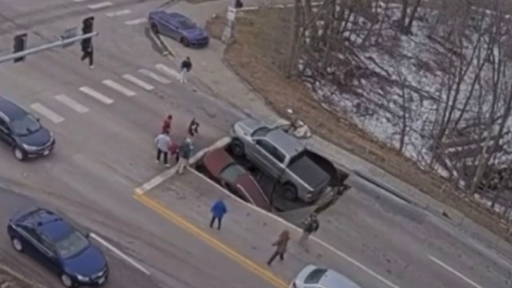 According to First Alert 6, the incident happened near 67th Street and Pacific Street in the city’s Aksarben neighborhood when a section of roadway suddenly collapsed beneath traffic. In the video, the ground appears to give way without warning, sending both vehicles plunging into the hole within seconds.