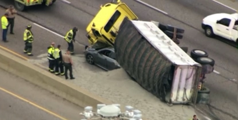 According to CBS Chicago, The crash happened near Wolf Road in Hillside, where authorities say a gravel-hauling truck struck a concrete barrier before flipping onto its side. The force of the crash caused the truck to land on top of a nearby passenger car, trapping it beneath the heavy vehicle and spilling large amounts of gravel across the roadway.