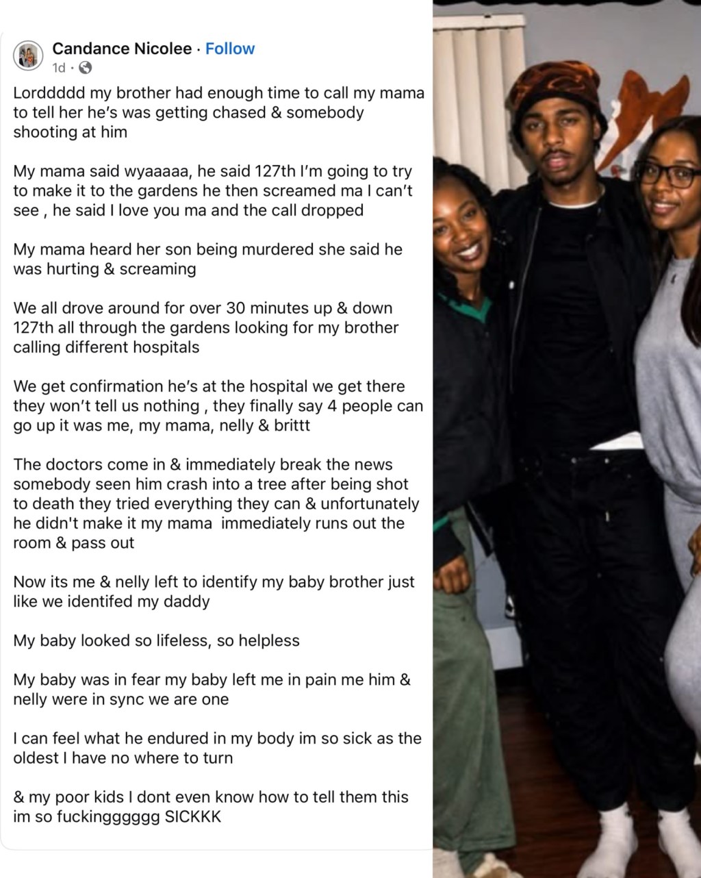 A Chicago woman is going viral after sharing a heartbreaking Facebook post detailing the final moments of her brother’s life. According to her post, he was being chased and shot at, and was able to call his mother before the call suddenly dropped.